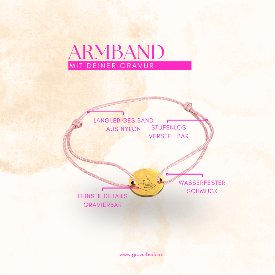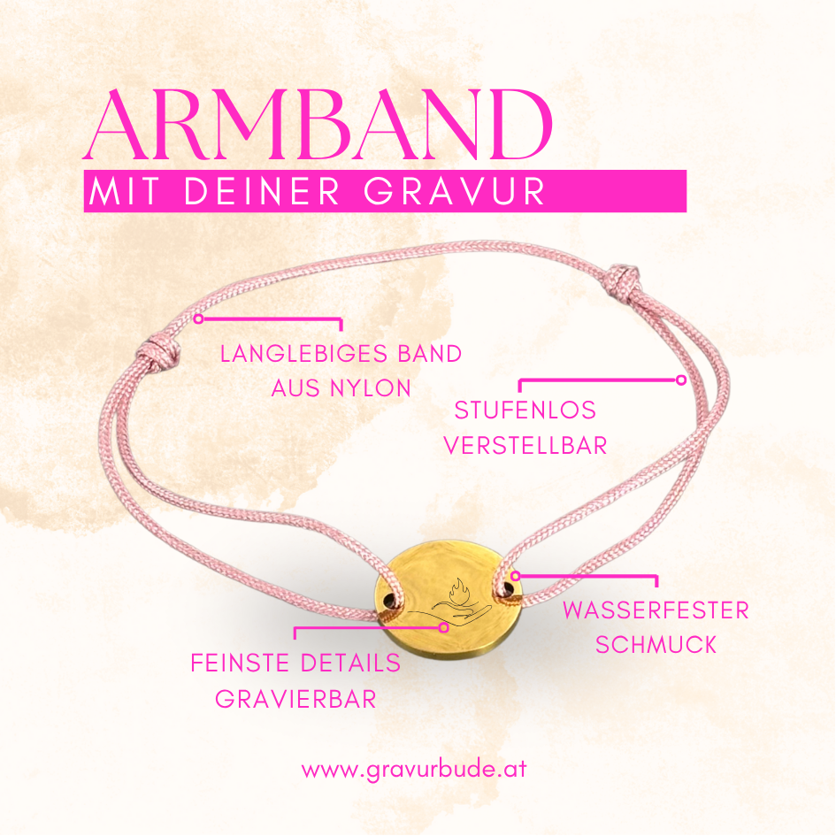 Zartes Rosé trifft auf Gold – Hochwertiges Nylon-Armband mit 12mm goldener Gravurmünze. Stufenlos verstellbar, wasserfest & schmuckecht. Personalisiere es mit Namen, Datum oder Symbol und trage dein einzigartiges Schmuckstück jeden Tag!